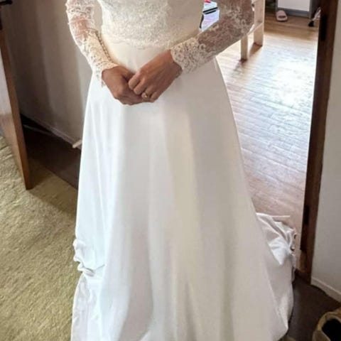 Smuk brudekjole fra Bianco Evento. Str small, men jeg er selv normalt tættere på en medium. Længde tilpasset til 175 cm højde + sandaler med hæl.