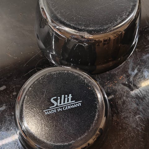 2 skåle i rustfrit stål. Skålene er nye. Mærket er Silit. Den største skål måler 21,5 cm i diameteren og 8,5 cm i højden. Den mindste skål måler 18 cm i diameteren og 6,5 cm i højden.