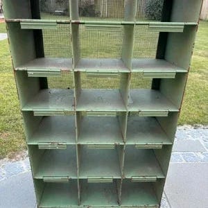 Sjælden gammel postfordeler i metalgrøn farve og 42 individuelle rum til opbevaring af vinflasker, sko, garn, legetøj mm.