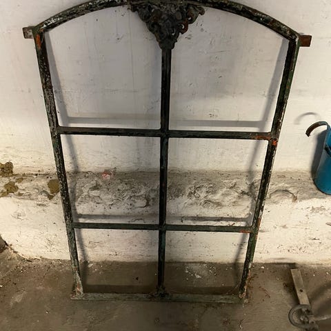 Rustik metalvindue med buet top, opdelt i mindre rudeinddelinger. Passer til dekorative formål eller som vinduesindsats i ældre eller renoverede bygninger. Fremstillet i metal med synlige tegn på brug og patina.