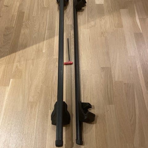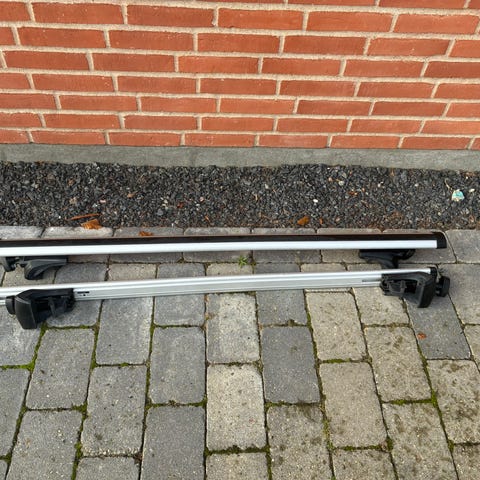 Thule tagbøjler med tilhørende beslag til montering på bilens tag. Består af to tværstænger i aluminium og flere plastikbeslag til fastgørelse. Farve: sølv og sort. Designet til at bære ekstra last som cykler, kufferter eller andet udstyr på bilens tag.