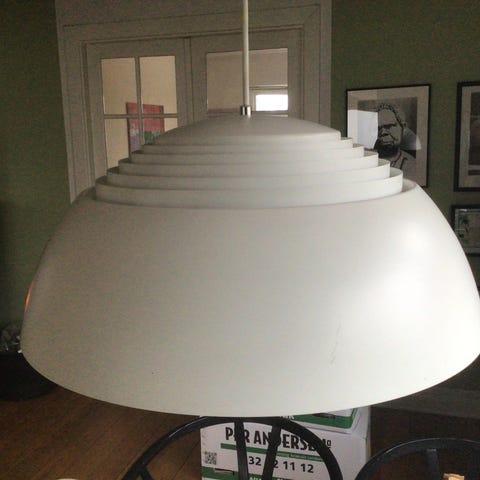 Louis Poulsen AJ Pendel Lamper i hvid opal farve. Lamperne har en rund, kuppelformet skærm og er designet til at hænge fra loftet. Den er egnet til brug i forskellige rum, som køkken eller stue, og giver et blødt, diffust lys.
