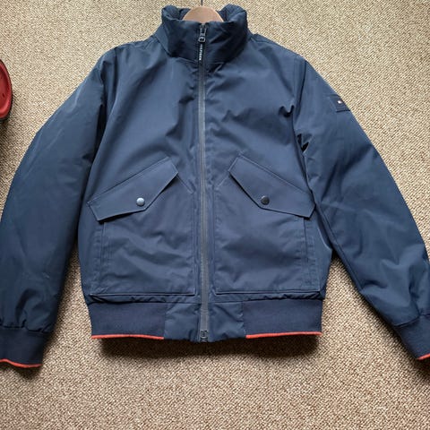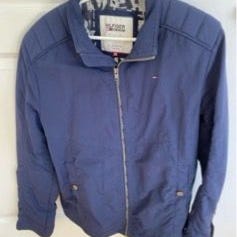 Tommy Hilfiger Denim jakke i blå farve, størrelse S til herrer. Der er en mindre synlig skade på jakken, som ses på billedet.