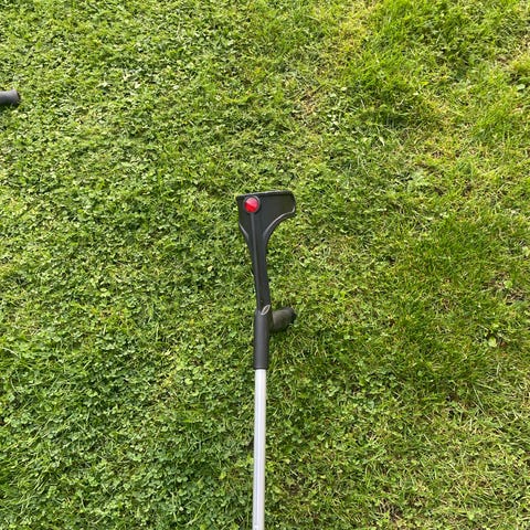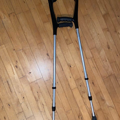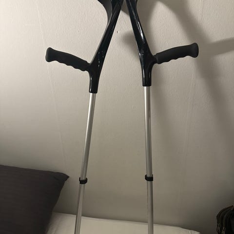 Aluminium underarmsskinner med justerbar højde. Håndtag og støtte er sorte, stængerne er sølv. De er designet til at give støtte og stabilitet, når man går. Passer til voksne. 100 kr pr. stk. 2 for 175kr.