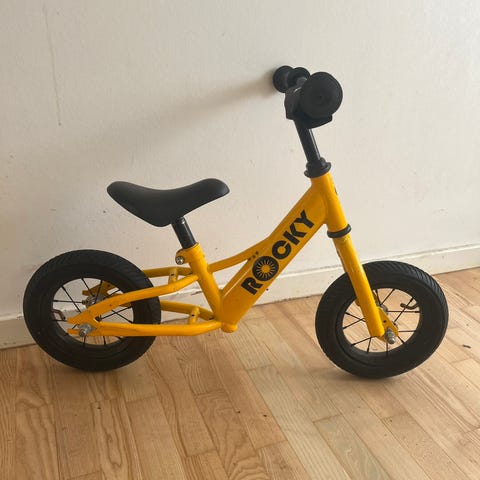Flot borderød løbecykel med justerbar siddehøjde og dæk med slange den skal pumpes men er ikke punkteret