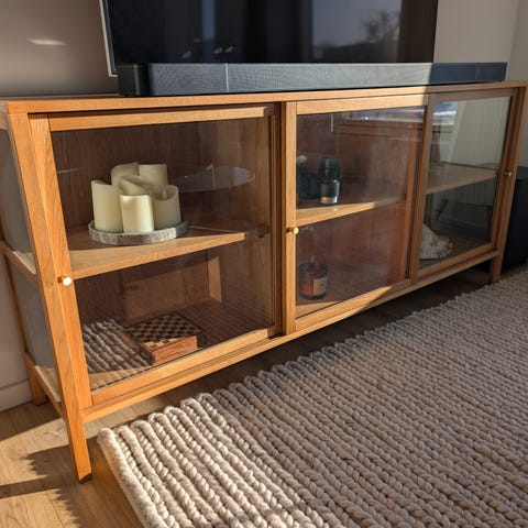 En flot skænk i sæbebehandlet egetræ. Lågene er i laminat. Lyseblå på den ene side og hvid på den anden side. Bag skydedørene er der hylde i hver side. Er i flot stand, dog krummer den lille smule i midten. Længde 120 cm, højde 68 og dybde 35 cm. Hentes i Ølstykke.