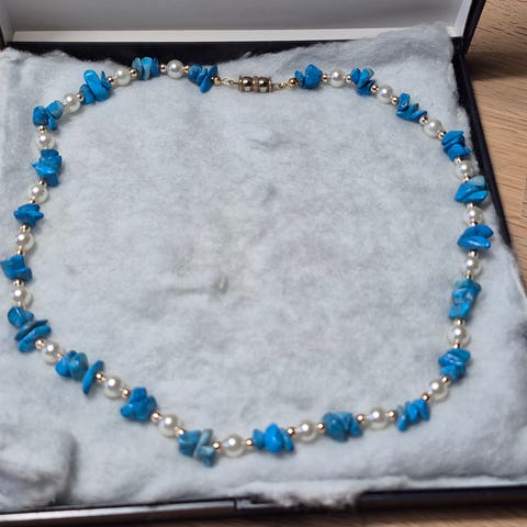 Sælger dette smukke og næsten ubrugte turkis/naturperlekæde/koral armbånd med en længde på 18 cm med forgyldt lukning.