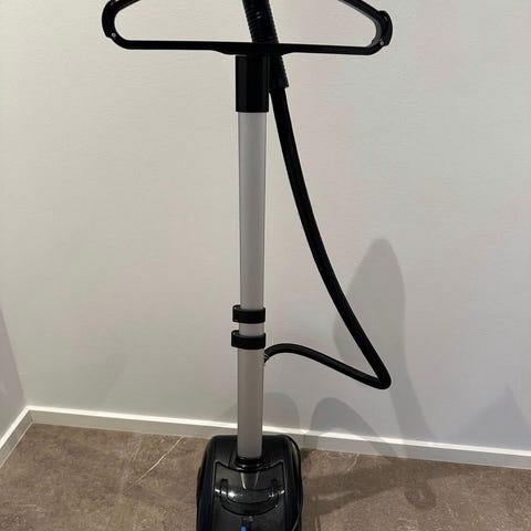 Årets julegave ide! Nordic Sense Steamer i sort farve med justerbar højde og integreret bøjle til tøj. Enheden har en stabil base med kontrolknapper og en metalstang til ophængning. Designet til at dampe og fjerne folder fra tøj uden behov for et strygebræt.