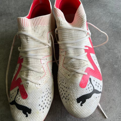 Puma fodboldsko i størrelse 42. Skoene er hvide med røde detaljer og har en gummisål. Brugt få gange, da jeg må indrømme at de desværre er for små til mig.