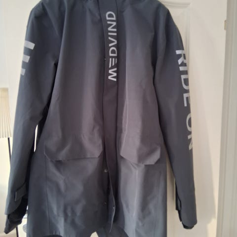 Ny olivengrøn regnjakke med aftagelig hætte, lynlåslommer og reflekser. Perfekt til cykling. Vand og vindtæt og åndbar. Det er en unisex, str. M, måler 80 cm i længden, lidt kortere foran og 55 cm fra ærmegab til ærmegab.