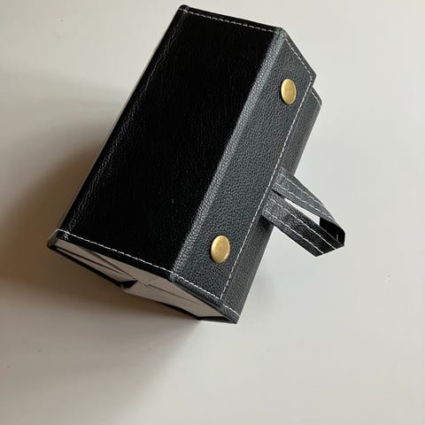 Flot og stilren opbevaringsboks i sort kunstlæder med hvide syninger og glaslåg. Perfekt til at holde dine solbriller organiseret og fri for støv.