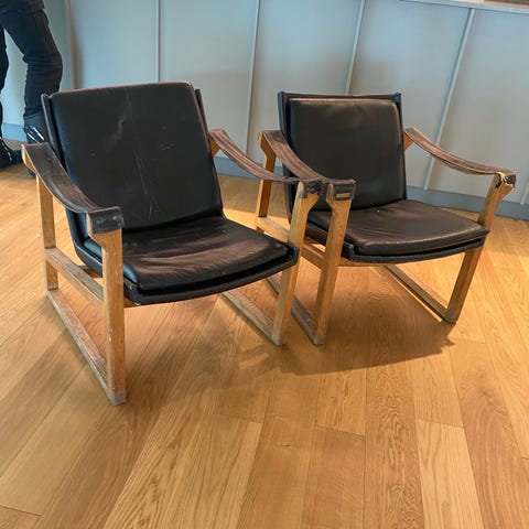2 stk. loungestole i sort læderflet og forkromet stel fra 1960´erne med to støttestænger under sædet og en støttestang i ryggen. Fremstår i rigtig fin stand. Sælges samlet.
