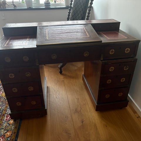Skrivebordet er med nedfældelig plade og talrige skuffer og rum der giver masser af opbevaringsmuligheder.