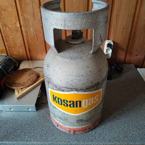 Flasken byttes lige over med fyldt dansk 11 kg. Flaske evt. salg kr. 500 med gas