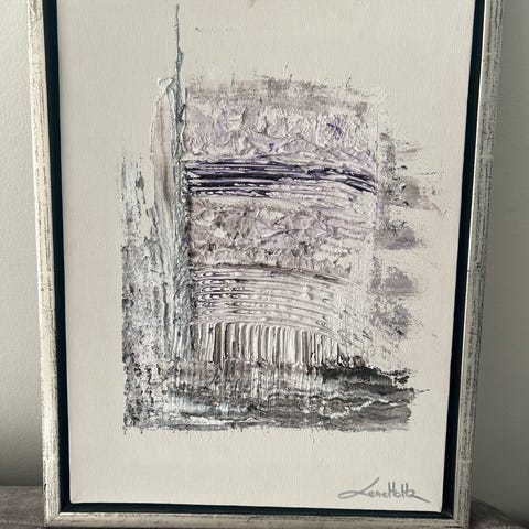 Lille akrylmaleri af HelleGrim i røde,gule toner i passepartout inkl. Hvid ramme og front"glas". Mål 15x15 cm. Kan sendes.