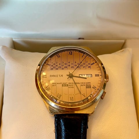 Et unikt ur fra mærket CCCP-Rusland.Konstantin Tsiolkovsky var den russiske raketvidenskabs far.Han udviklede indsigter i der stadig er i brug over hundrede år senere,hvilket gav ham en plads i historien som en af pionererne inden for astronautik .Uret kommer med et specielt automatisk Slava-værk.Dette ur er unikt på grund af den dobbelte tønde inde i værket,som har 22 juveler.Remmen er læder ,diameter -43 mm.Originale papir ,æske og garanti medfører.