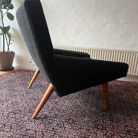 Illum Wikkelsø lænestol med stel af bøgetræ, sider og ryg af fransk rørflet, løse hynder betrukket med cremefarvet knapsyet møbelstof. Fremstillet hos CFC Silkeborg, model 'Plexus'.
