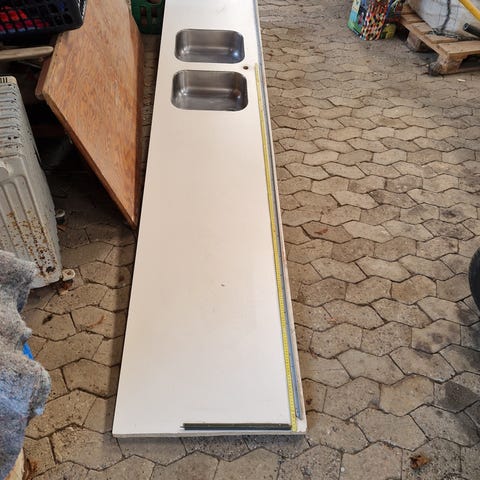 Mål 58 x 116 cm. med rundet forkant. Pladen er renskåren og er i vinkel samt pudset/slebet. Fra nedtaget køkken. Er opbevaret tørt. God til Værkstedsbord eller andet hvor pladen skal være kraftig. Tlf 50472082