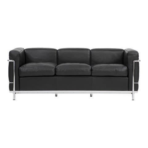 Denne elegante 3-personers sofa er betrukket med smukt sort læder og har et robust kromstel, som giver et tidløst og stilrent udtryk.