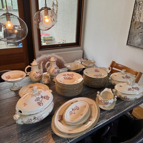 Brun Rose kaffekopper med underkop og kagetallerken. I meget fin stand. 1 sæt koster 79 kr. Flere sæt kan tikøbes. Samt flere fade. Kander. Mm.
