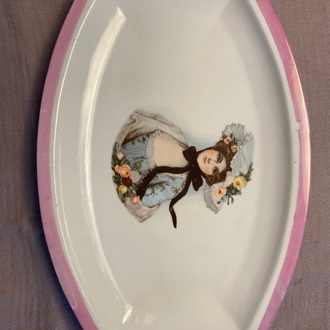 Ovalt fad med violet / lilla / pink / magenta og lyserød mønster af fasaner og blomster.