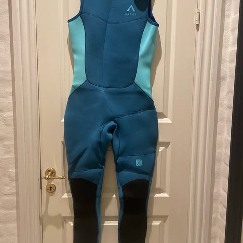 Sæt bestående af kortærmede neopren våddragter i blå og grå farver. Materialet er neopren, som giver isolering og fleksibilitet ved vandsport. Passer til forskellige størrelser og er designet til at give komfort og bevægelsesfrihed ved aktiviteter i vand.