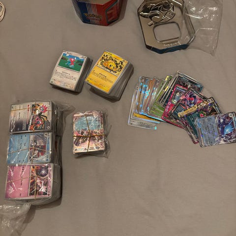 Samling af Pokémon spillekort med forskellige karakterer og energityper. Kortene inkluderer både almindelige og holografiske varianter i forskellige farver og designs. Velegnet til samlere og spillere af Pokémon kortspillet.
