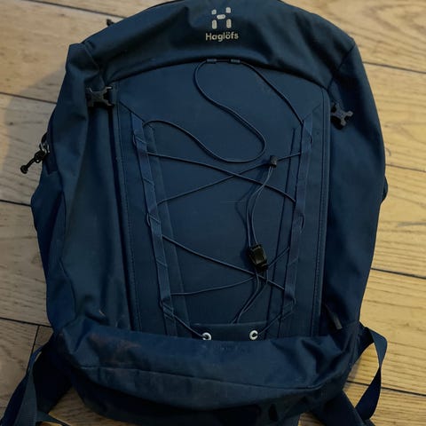 Sort Haglöfs Backup rygsæk med justerbare stropper og flere rum. Rygsækken har en orange detalje ved lynlåsen og et broderet logo på forsiden. Der er pletter på toppen og indvendigt.