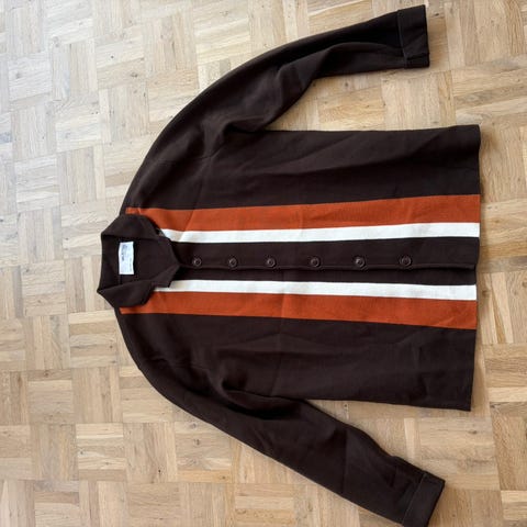 TWN 70s beige strikcardigan. Str L.Stoffet midtpå ligner en vest og kan knappes op