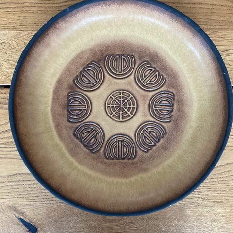 Fint lille vintage fad. Fin orange/brun farve og glasur. Den er signeret, men jeg kan ikke tyde hvad der står. Lille afslag.