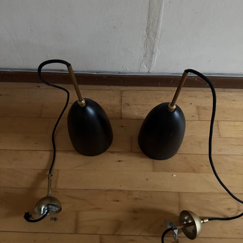 Vi har to helt nye og fine messing grå loftslamper til overs fra vores renovering, som stadig står i original emballage og kun håndholdt hængt op for at se om farven matchede vores maleri: Nypris hos Gubi: 2500 kr. - sælges for 975 kr. eller begge for 1850 kr.