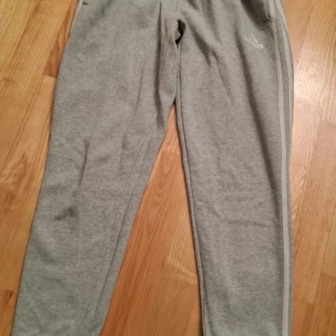 Adidas joggingbukser i hvid farve, størrelse S til kvinder. Bukserne har klassiske sorte striber langs siderne og Adidas-logo på låret. Materialet er blødt og egnet til sport og fritid.