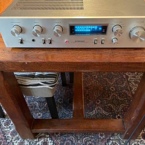 Pioneer SA-940 stereo forstærker med non switching amp teknologi, SG-540 grafisk equalizer, TX-840 digital synthesizer tuner og DT-540 audio digital timer. Enhederne har en sølvfarvet finish og er designet til at forbedre lydkvaliteten i et hi-fi system.