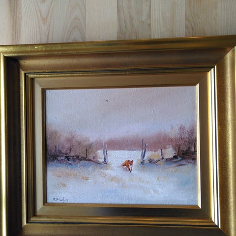 Stort og stemningsfuldt oliemaleri af et dansk vinterlandskab med sne, vandløb og solnedgang. Et roligt og harmonisk motiv, der skaber varme og hygge i ethvert rum. Farverne er bløde og naturlige, og kompositionen giver en stærk fornemmelse af vinterstilhed, refleksion og dybde i landskabet.
