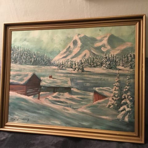 Stort oliemaleri – vinterlandskab med sne og solnedgang