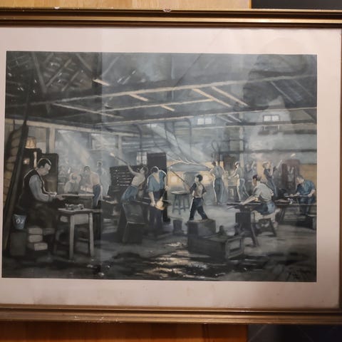 Industri-motiv fra 1948 – arbejdsfolk i værksted/smedje – signeret tryk