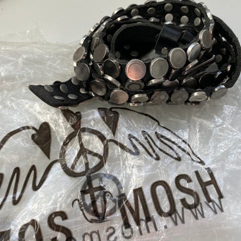 Mos Moch læderbælte til unisex. Bæltet er brunt og lavet af læder med metalnitter som dekoration. Designet inkluderer justerbare huller til tilpasning af størrelsen.