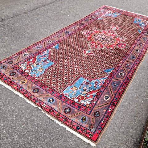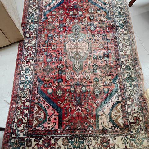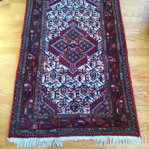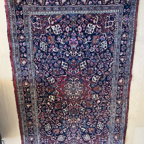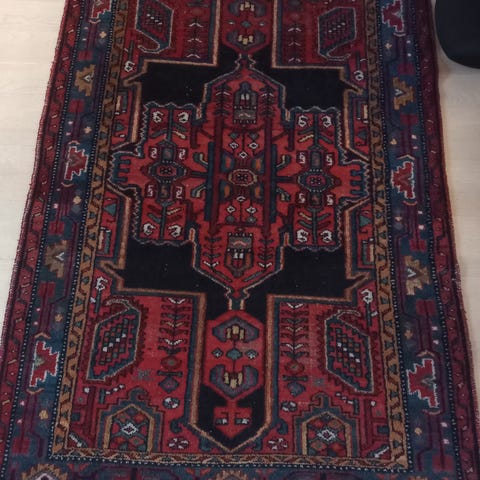 Smukt ældre uldtæppe fra Iran, måler 85×155 cm. Klassisk geometrisk medaljonmønster i rød, brun, blå og elfenbenshvid. Håndknyttet uldluvpå bomuldsbund, plantefarver, god stand med lidt slid på ender. Fast vævning og ægte patina – ikke maskinvævet. Skal vaskes.