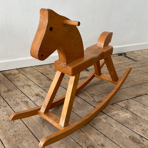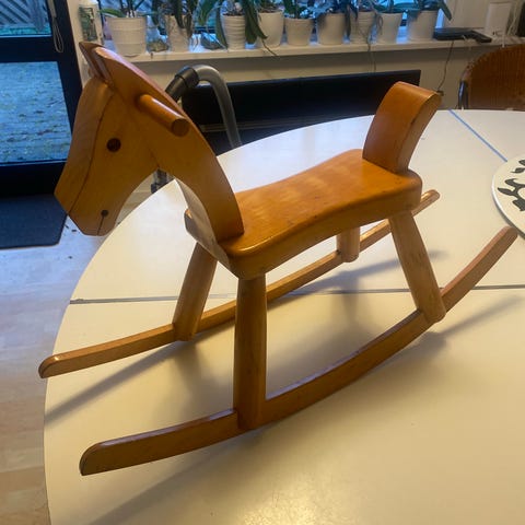 Træ gyngehest designet af Kay Bojesen; naturfarvet træ. Har mindre brugsspor, især på bunden af gyngestolens ben; det sidste billede viser det grimmeste sted på hesten.