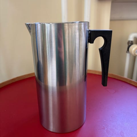 Jeg sælger denne Stelton stempelkande fra den eksklusive AdColour-serie, designet af Stan Smith, med det ikoniske Cylinda-design af Arne Jacobsen.