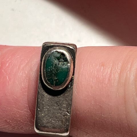 Sølvring med en sten af grøn malakit, str. 56.