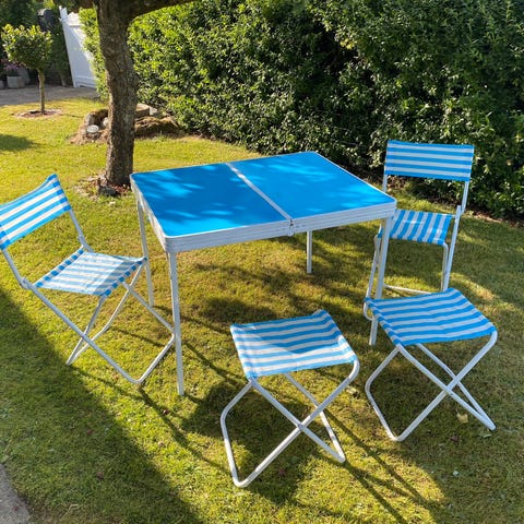 Vintage camping sæt med klap ud bord og stole.