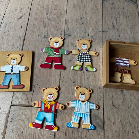 HABA børnetøj i stof med forskellige farver og knapper samt lynlås til øvelse af finmotorik hos børn. Indeholder flere dele i forskellige teksturer og farver, designet til at hjælpe børn med at lære at klæde sig selv.