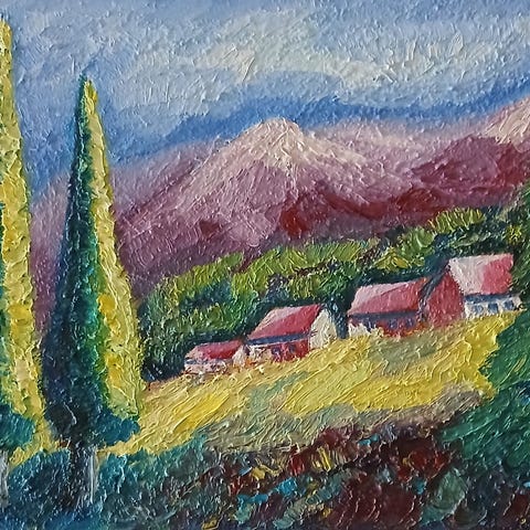 Maleri forestillende et landskab med et hus og træer. Maleriet har en horisontlinje med himmel og skyer, samt naturdetaljer i forgrunden. Farverne domineres af blå, grønne og jordfarver. Ramme i lyst træ.
