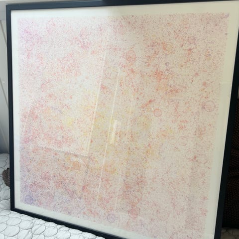 Henrik Brun abstrakt maleri med ramme. Maleriet har en farvepalette domineret af orange, sort, hvid og gule nuancer. Det er et kunstværk med tydelige penselstrøg og tekstur.