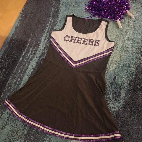 Partymix Kvinde Cheerleader Kostume bestående af pink top med hvide bogstaver og hvid nederdel med pink striber.
