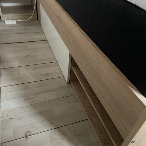 Jysk sengeramme med lamelbund i træ og fjedre madras med gråt stofbetræk. Mål: 90x200 cm. Passer til enkeltpersoner og ideel til fx gæsteværelse.