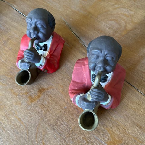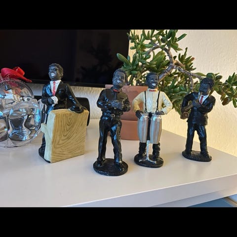 Sæt bestående af tre musikantfigurer i forskellige farvede jakkesæt: grøn, hvid og lyseblå. Figurerne er fremstillet i malet materiale og forestiller musikere med instrumenter, kontrabas, trompet og saxofon. Hver figur står på en sort base. Sættet kan anvendes som dekorative elementer i hjem eller offentlige rum.