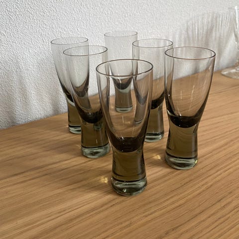 Holmegaard snapseglas i røgfarvet Glassene har en cylindrisk form og er fremstillet af klart, røgfarvet glas. Design Per Lütken 1965, 18444