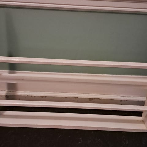 Hylde også kaldet tallerkenrække i fin stand til fade, tallerkener eller til børnebøger på børneværelset. Enkel i hvid-olieret fyrretræ med fine detaljer. Kan evt males i fin pastelfarve og passes ind i køkken/alrum eller børneværelse. Kom gerne med et seriøst bud.